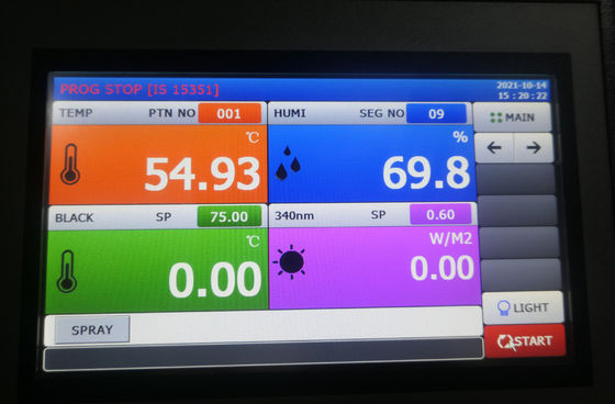 2. Цветной сенсорный экран, отображающий состояние камеры в режиме реального времени, возможность предварительной настройки освещенности, температуры (BPT, BST, камера), влажности и построения их динамической кривой.Оператор просто выбирает необходимый тестовый модуль и тестовые стандарты;Английский пользовательский интерфейс, диаграмма показывает состояние камеры, проста в использовании;